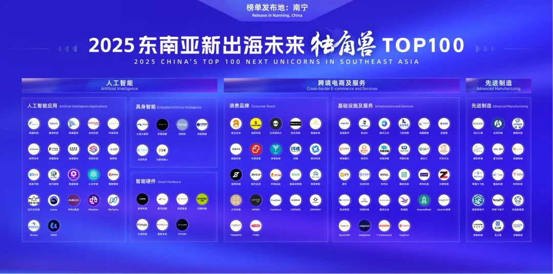 其中,《2025东南亚新出海未来独角兽TOP100》榜单在五象新区(自贸试验区南宁片区)管委会的支持下,由微链联合广西东盟跨境电商总部基地共同推出,是继去年首次发布后的第二届。榜单从超过500家企业中遴选出100家在东盟市场展现出巨大成长潜力的企业,旨在挖掘和培育面向东盟市场的高成长性科技企业,推动“北上广研发+广西集成+东盟应用”跨境产业生态体系建设,涵盖人工智能、跨境电商及服务以及先进制造三大板块。
