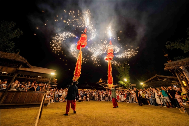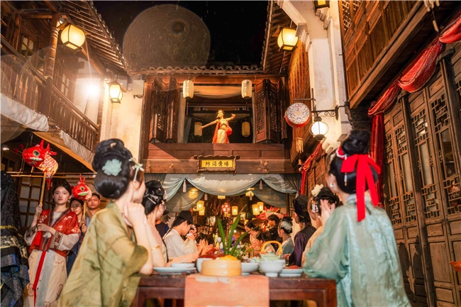 古镇体验更以“动静相宜”为特色,营造出张弛有度的度假节奏。“濮院织秋”主题活动通过“遇见宋潮、秋日收藏、织造艺术、疗愈生活”四大单元,打造出丰富立体的体验矩阵:日间可漫步街巷,在颂钵音疗、宋式点茶中静心养性;夜晚则融入“濮院梦华录”超长夜秀,在数十场不间断演绎与NPC构筑的宋韵场景中,体验“我在宋朝躺赢的一天”。这种从静谧疗愈到沉浸互动的自如切换,让不同偏好的游客都能找到属于自己的节奏。