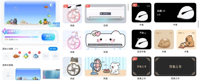 创意小组件库:集成桌面水族箱、打工人时钟、敲木鱼、空调、风扇等趣味互动元素,在桌面就可以享受养鱼的乐趣,心烦了还可以敲敲木鱼静心,翻开答案之书解答心中的疑惑、这些创意的壁纸、小组件,能够满足不同用户的需求。